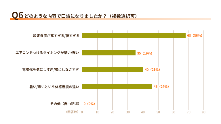 回答数が多かったのは「設定温度が高すぎる/低すぎる」(23%)、次いで「暑い/寒いという体感温度の違い」(15%)でした。快適さの感じ方やエアコンの設定温度の好みは人によって異なるため、衝突の要因になりがちといえます。
