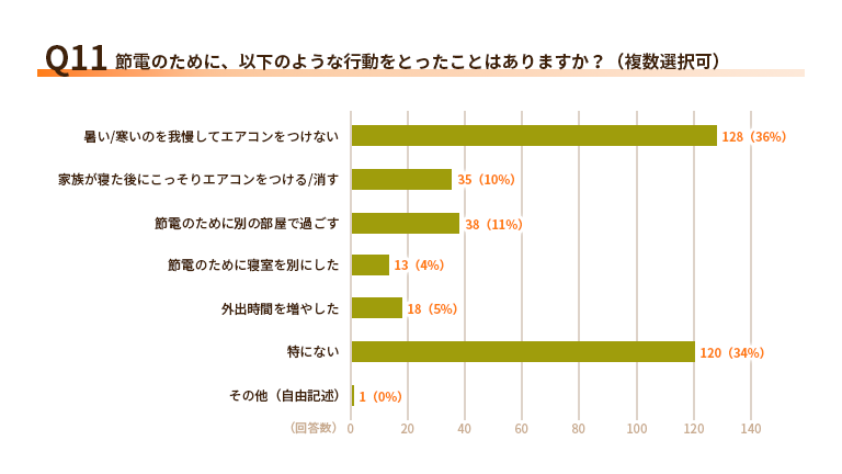 この質問では、「暑い/寒いのを我慢してエアコンをつけない」が最多で43%が該当しました。快適さよりも電気代を気にする方が多いことがわかります。