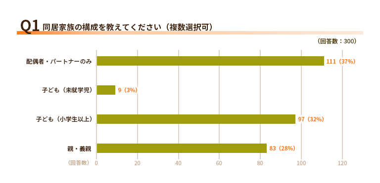 続いて同居家族の構成では、「配偶者・パートナーのみ」が37%と最多で、「子ども(小学生以上)」が32%、「親・義親」が28%と続いています。また、「子ども(未就学児)」と回答した方も3%いました。