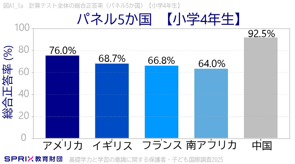 パネル5か国(アメリカ、イギリス、フランス、南アフリカ、中国)で小学4年生・中学2年生での計算テスト全体の総合正答率を比較しました。いずれの学年でも、中国が比較的高い正答率を示しました。