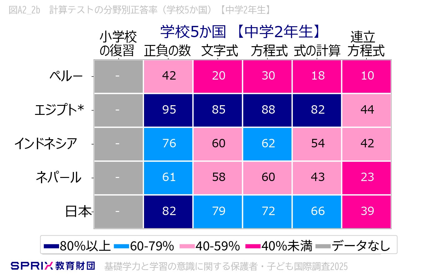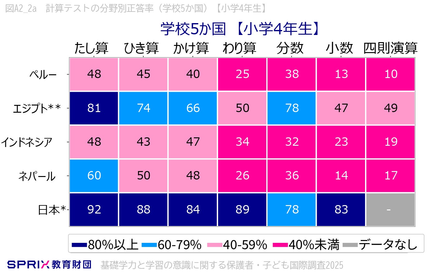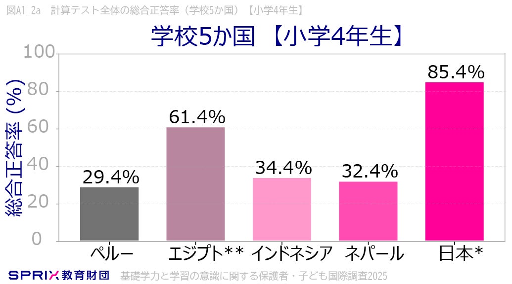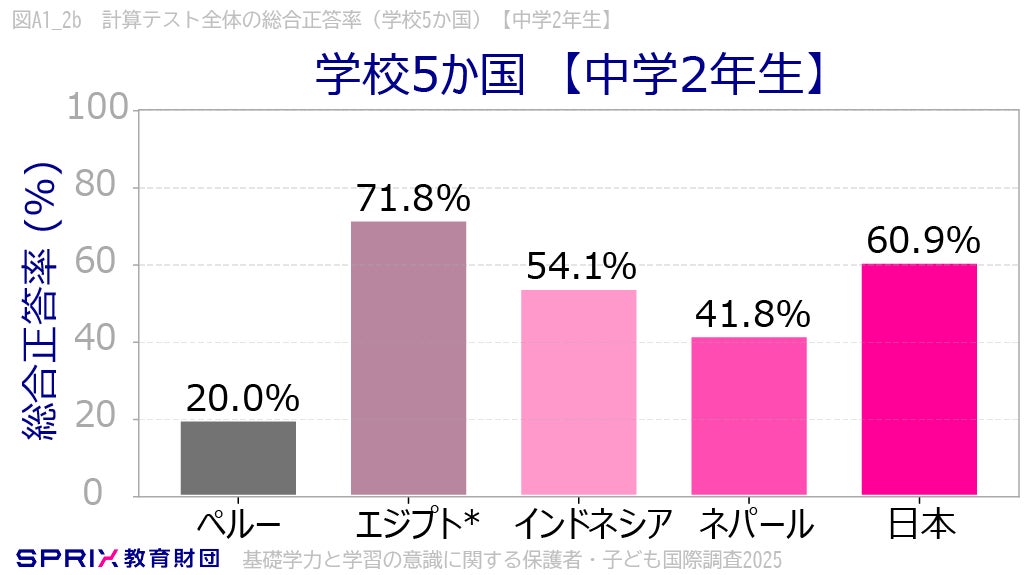 学校5か国(ペルー、エジプト、インドネシア、ネパール、日本)でも小学4年生・中学2年生で計算テスト全体の総合正答率を比較しました。