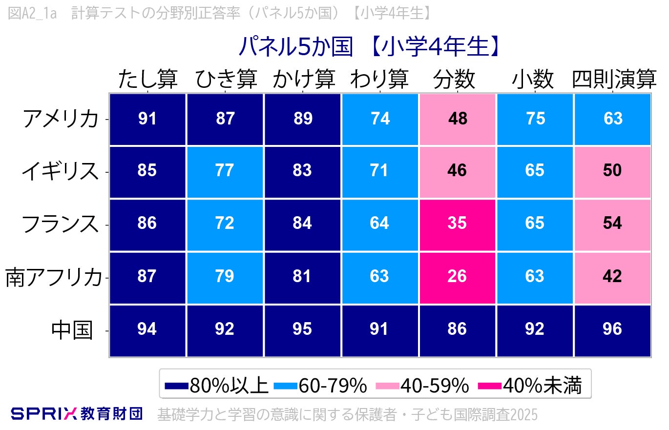 公益財団法人スプリックス教育財団(本部:東京都渋谷区/代表理事:常石 博之)は、基礎学力に対する意識の現状を把握することを目的に、「基礎学力と学習の意識に関する保護者・子ども国際調査2025」を実施しました。本報告では、A) 基礎学力調査(計算テスト)、B) 保護者の意識調査、C) 子どもの意識調査をそれぞれ総括します。そして、世界と比較して明らかになった日本の教育環境の特徴を報告します。