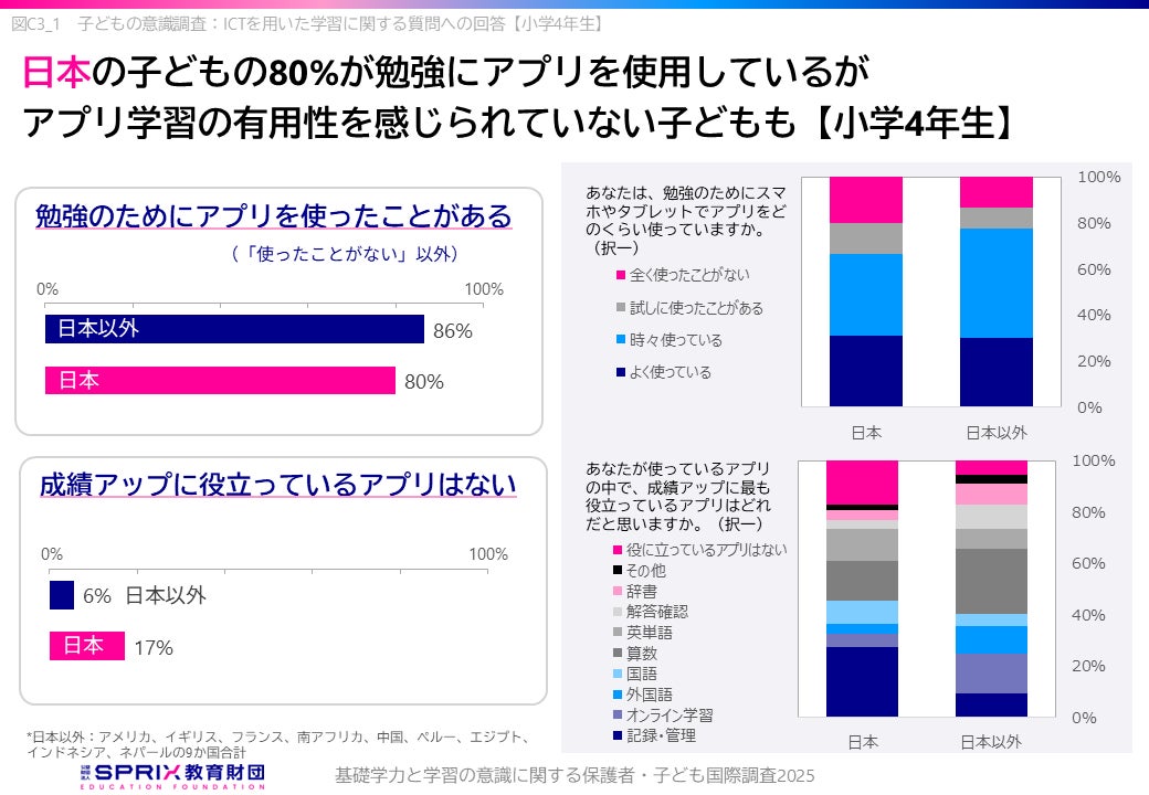 ただし日本の子どもは「役に立っているアプリはない」と回答する割合が日本以外と比べて高く、アプリ学習の有用性を感じている割合が小さいことが特徴です。