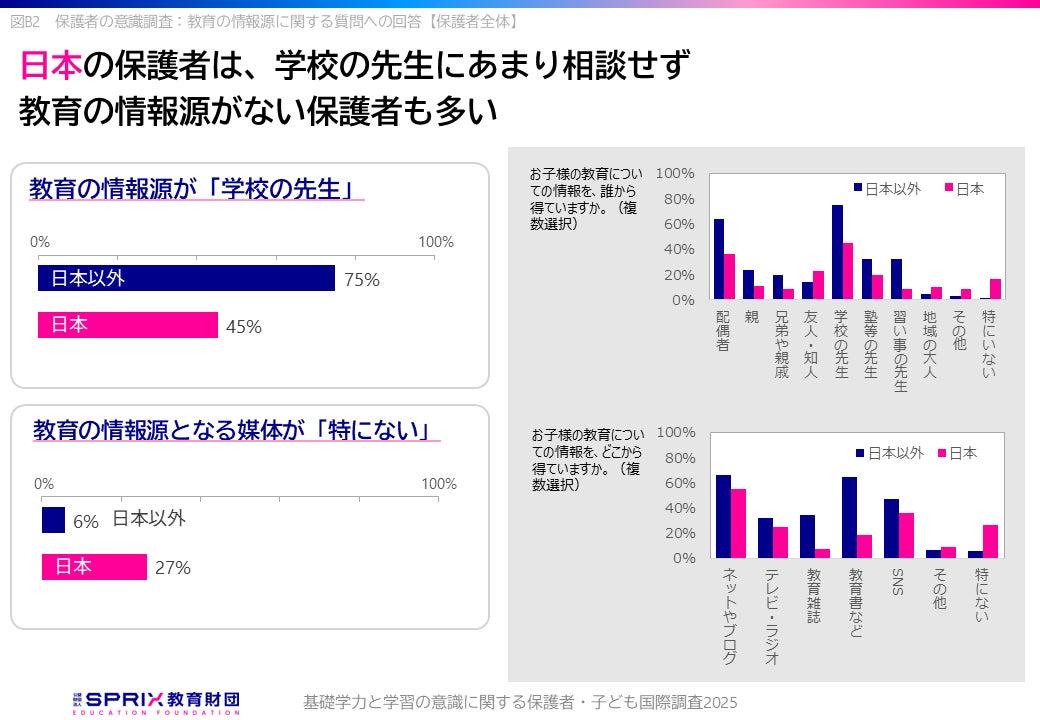 対照的に日本の保護者は、学校の先生に相談する割合が相対的に少なく、また「情報を得る媒体が特にない」と回答する層が日本以外に比べると多いのが特徴です。