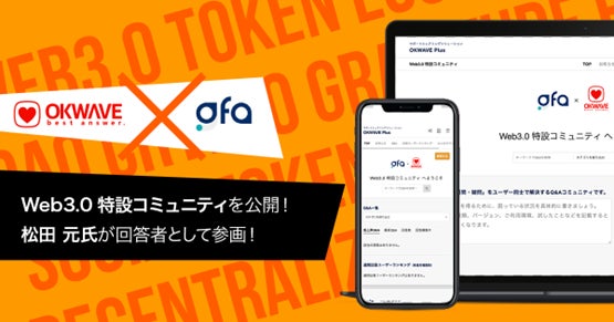 GFA株式会社(以下、「当社」とする。)は、「世界中のありがとうの物語を蓄積し可視化する」をパーパスとし、法人・個人向けコミュニティサービスを展開する株式会社オウケイウェイヴ(証券コード:3808 以下、「オウケイウェイヴ」といいます。)との業務提携の第三弾施策として、オウケイウェイヴが提供する『OKWAVE Plus』に、「Web3.0特設コミュニティ」を開設し、当社代表の松田元が専門家回答者として参画いたします。