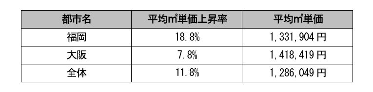 その一方で、関西最大の都市である大阪においては、上昇率が7.8%に留まり、福岡と比較するとその上昇率は限定的でした。福岡・大阪の2都市の平均では11.8%の上昇でした。