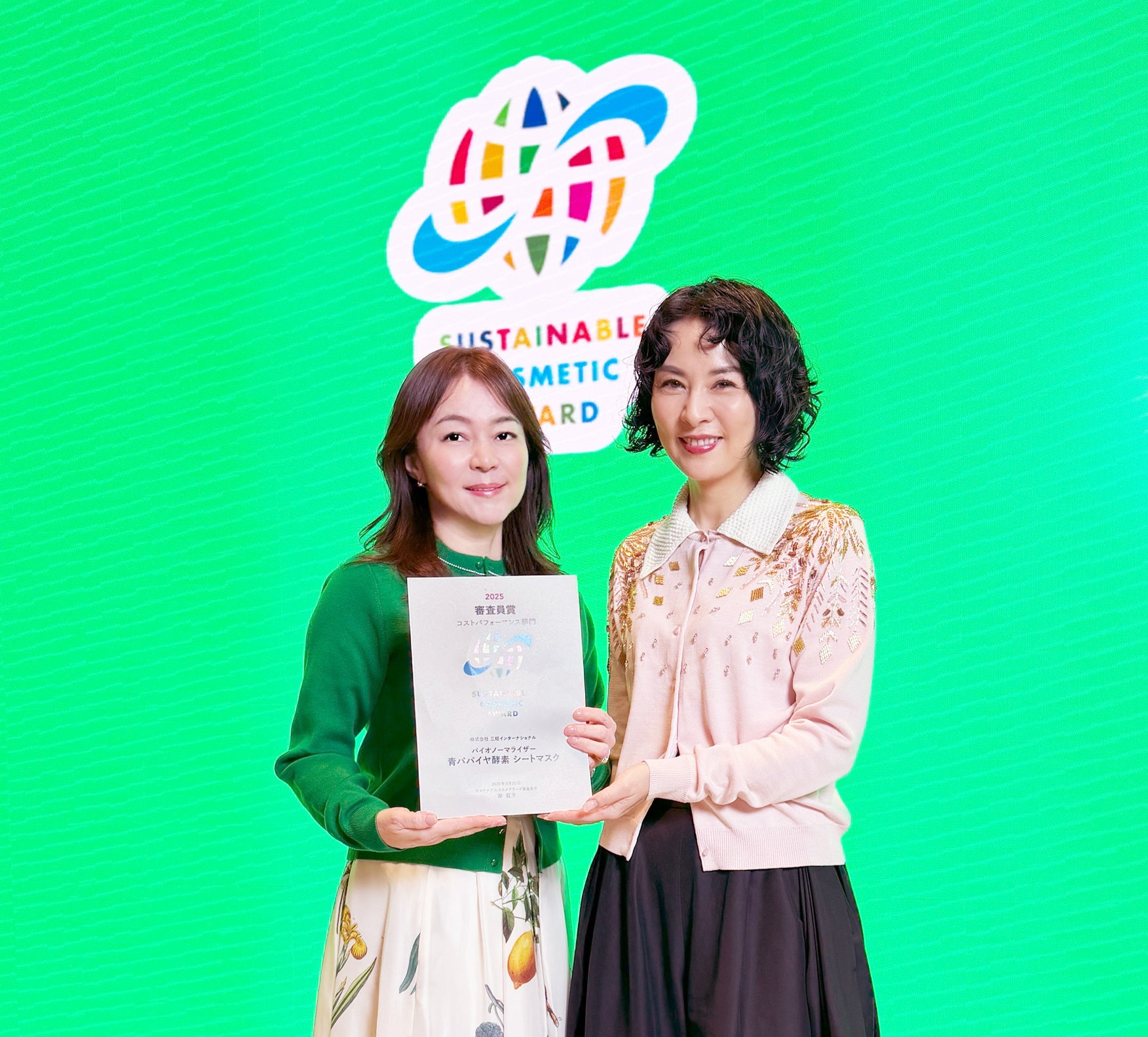 株式会社三旺インターナショナル(代表取締役:前田健司、本社:岐阜県岐阜市)が販売する商品「青パパイヤ酵素シートマスク」が、人にも地球にもやさしいコスメを表彰する「サステナブルコスメアワード2025」において、「審査員賞(コストパフォーマンス部門)」を受賞いたしました。