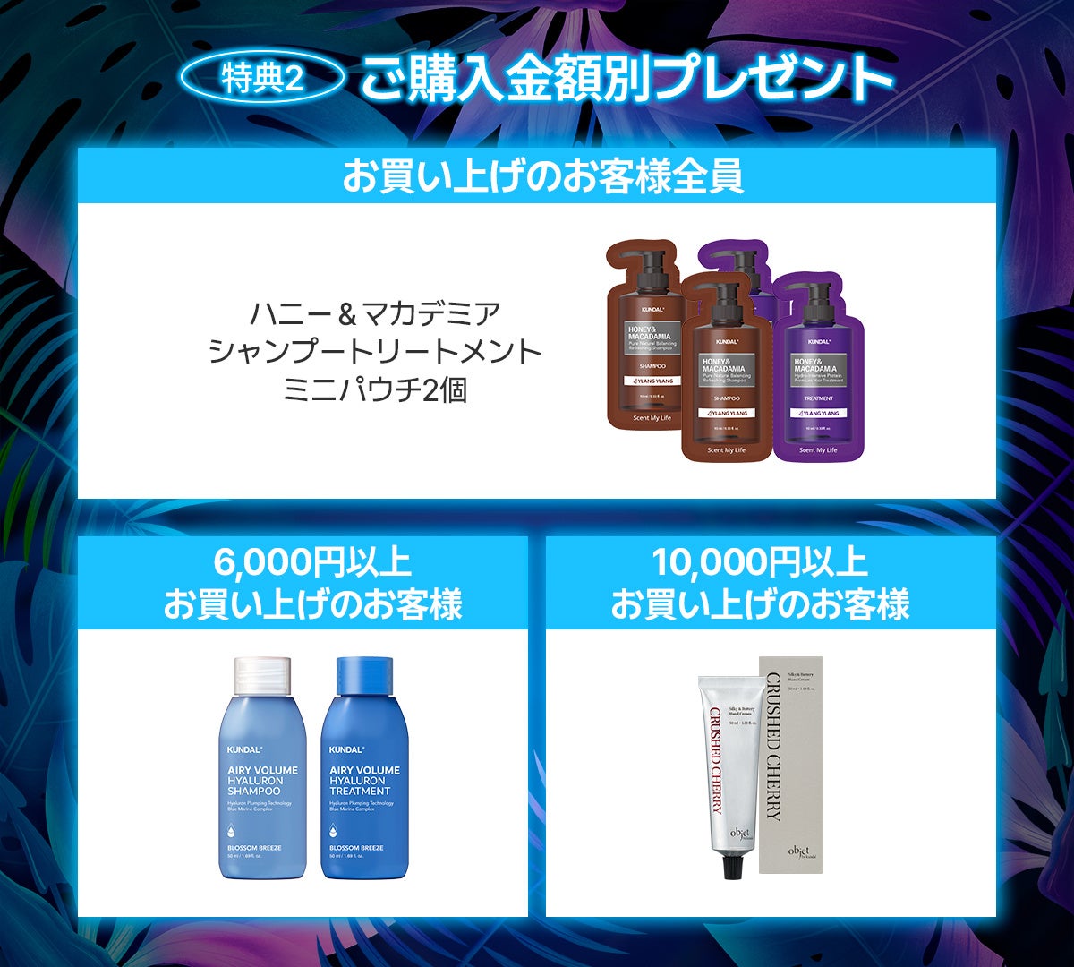 ・6,000円以上お買い上げのお客様には【ヒアルロンエアリーボリュームシャンプー・トリートメント】50mlセットをプレゼント