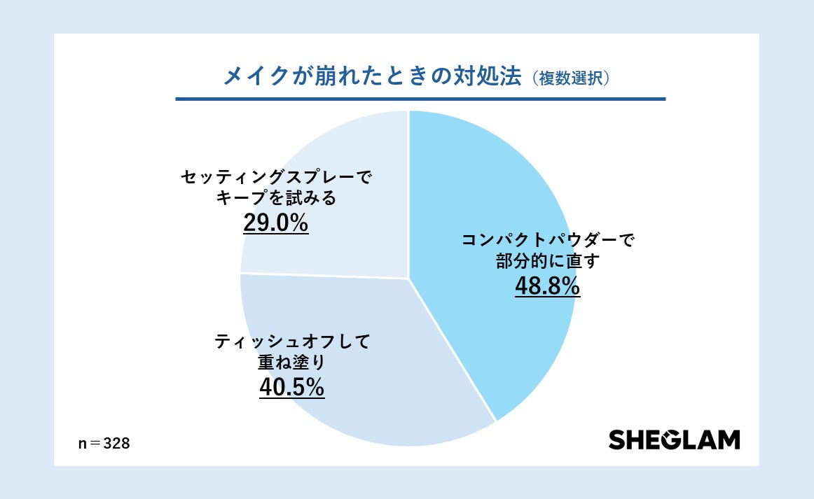 「メイクが崩れたとき、どのように対処していますか?」という質問に対して、「コンパクトパウダーで部分的に直す」が約50%、「ティッシュオフして重ね塗り」が約40%と多く見られる一方で、約30%が「セッティングスプレーでキープを試みる」と回答し、予防的な手法を取り入れている回答も一定数存在している。