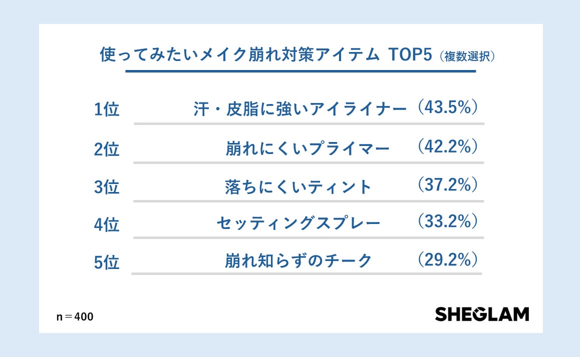 ⑤使ってみたいメイク崩れ対策アイテムに「汗・皮脂に強いアイライナー」と「崩れにくいプライマー」が並んで上位にランクイン。