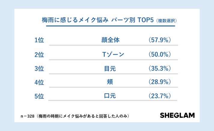 「梅雨に感じるメイク悩みは、どのパーツにおける悩みが多いですか?」という質問に対して、半数以上が「顔全体」にメイク悩みがあることが明らかに。その他、「Tゾーン」「目元」の次に、「頬」「口元」が続いた。カラーアイテムやラメワンポイントとなる部位は、崩れが目立ちやすいため悩みが感じられやすいことに加え、さらに汗や皮脂がたまりやすいため、梅雨の時期こそ気になるポイントに。