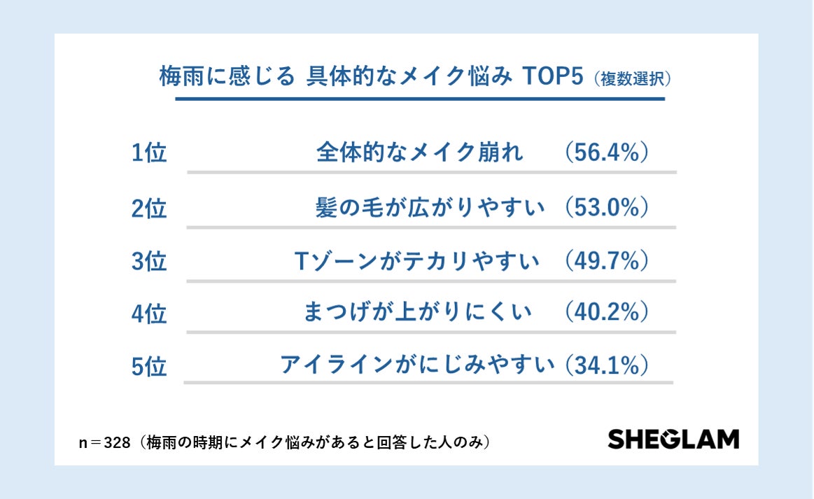 ③梅雨に感じるメイク悩みとして、1位「全体的なメイク崩れ」、2位「髪の毛が広がりやすい」、3位「Tゾーン」という結果に。