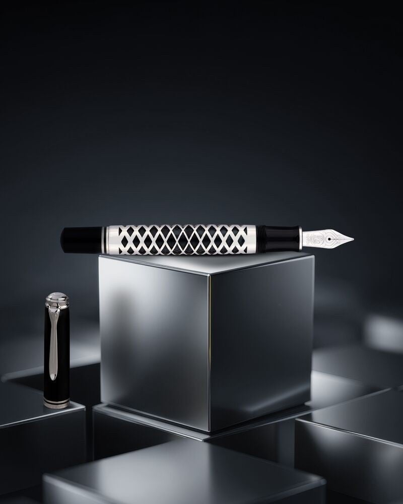 <ペリカン>ブラックの輝きと幾何学模様が織りなすモダンアートのような佇まい。精密な加工技術によって仕上げられたメタルスリーブが包み込む。特別生産品万年筆「M805メタルスリーブ」11月発売。