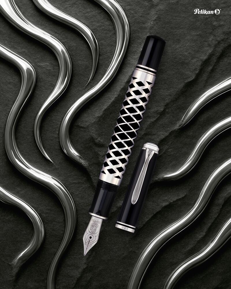 ドイツの高級筆記具ブランドが追求してきた精密さと美しさを象徴する一本。スケルトンボディに重なる幾何学模様のスリーブ。ペリカンの伝統×金属スリーブという希少な融合がこれまでにない上質な存在感を放ちます。