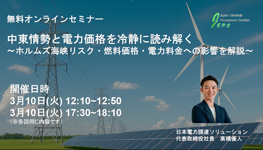 法人向けに電力調契約の最適化を支援している株式会社日本電力調達ソリューション(本社:東京都、代表取締役社長:高橋優人)は、中東情勢の緊張が高まる中、エネルギー市場の現状を整理する無料ウェビナー「中東情勢と電力価格を冷静に読み解く」を開催いたします。
