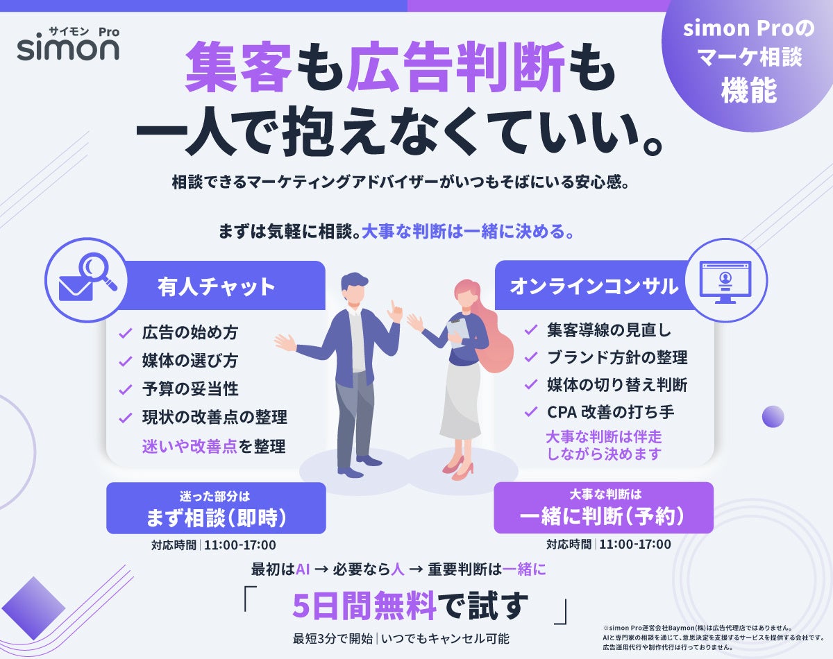 simon Proは、広告代理店や属人的な経験に依存してきたマーケティングの意思決定負荷を軽減し、個人マーケター、運用担当者、インハウス担当者、スモールビジネスなど、日々のマーケティング判断を実務レベルで最適化します。