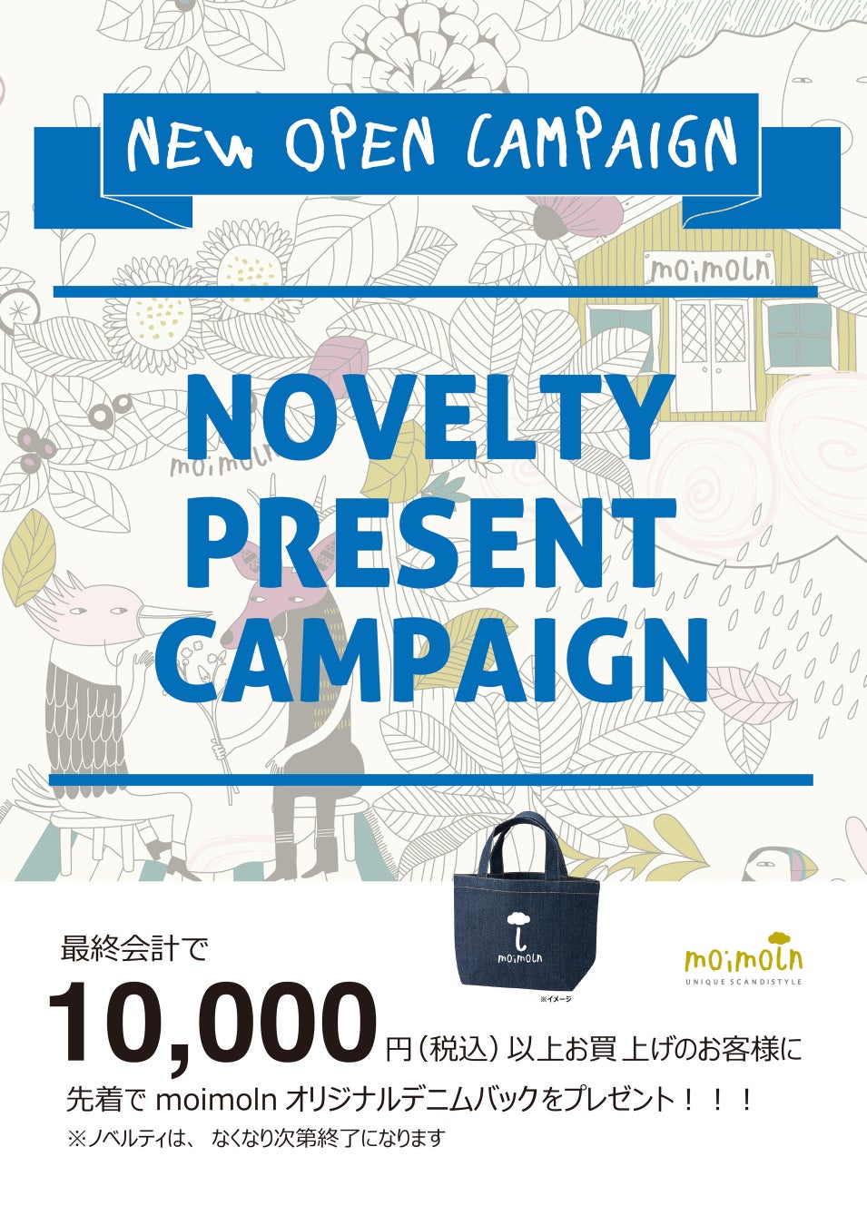 オープニングキャンペーンでは、商品合計税込10,000円以上お買い上げのお客様に「モイモルン オリジナルデニムバッグ」をプレゼントいたします。季節問わずお使いいただけるデニム素材で、親子でお使いいただけるミニタイプを数量限定でご用意しております。