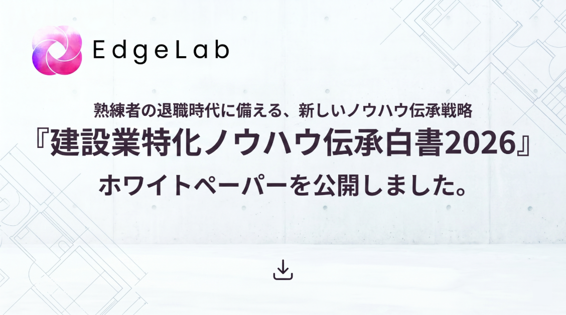 建設業界に特化したノウハウ伝承システム開発を手掛ける東大発スタートアップ・株式会社EdgeLab(本社:東京都文京区、代表取締役CEO:八木亮嘉、以下EdgeLab)は、熟練技術者の退職に伴うノウハウ消失リスクと、生成AIを用いて暗黙知を形式知化する最新戦略を解説したホワイトペーパー『建設業特化ノウハウ伝承白書2026』を公開しました。