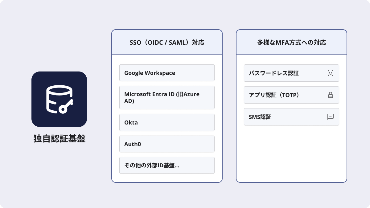 従来のSaaS型認証に依存しない構成により、OIDC / SAMLによるSSO統合、認証アプリ(TOTP)を用いた多要素認証(MFA)、重要操作時のステップアップ認証など、高度なセキュリティ要件に対応。認証データの保存リージョン制御や社内ID基盤との統合にも柔軟に対応可能となり、エンタープライズ企業に求められるセキュリティ・コンプライアンス・拡張性を同時に実現します。