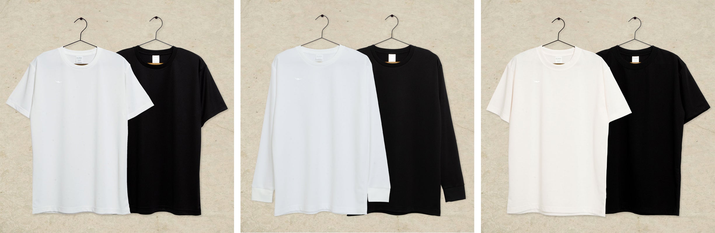 軽やかで快適な着心地のドライTシャツ、秋冬シーズンに最適なドライ長袖Tシャツ、綿のような風合いでしっかりした生地感が特徴のTシャツの3タイプ、各2カラー展開。季節や着用シーンによってチョイスできるラインナップです。