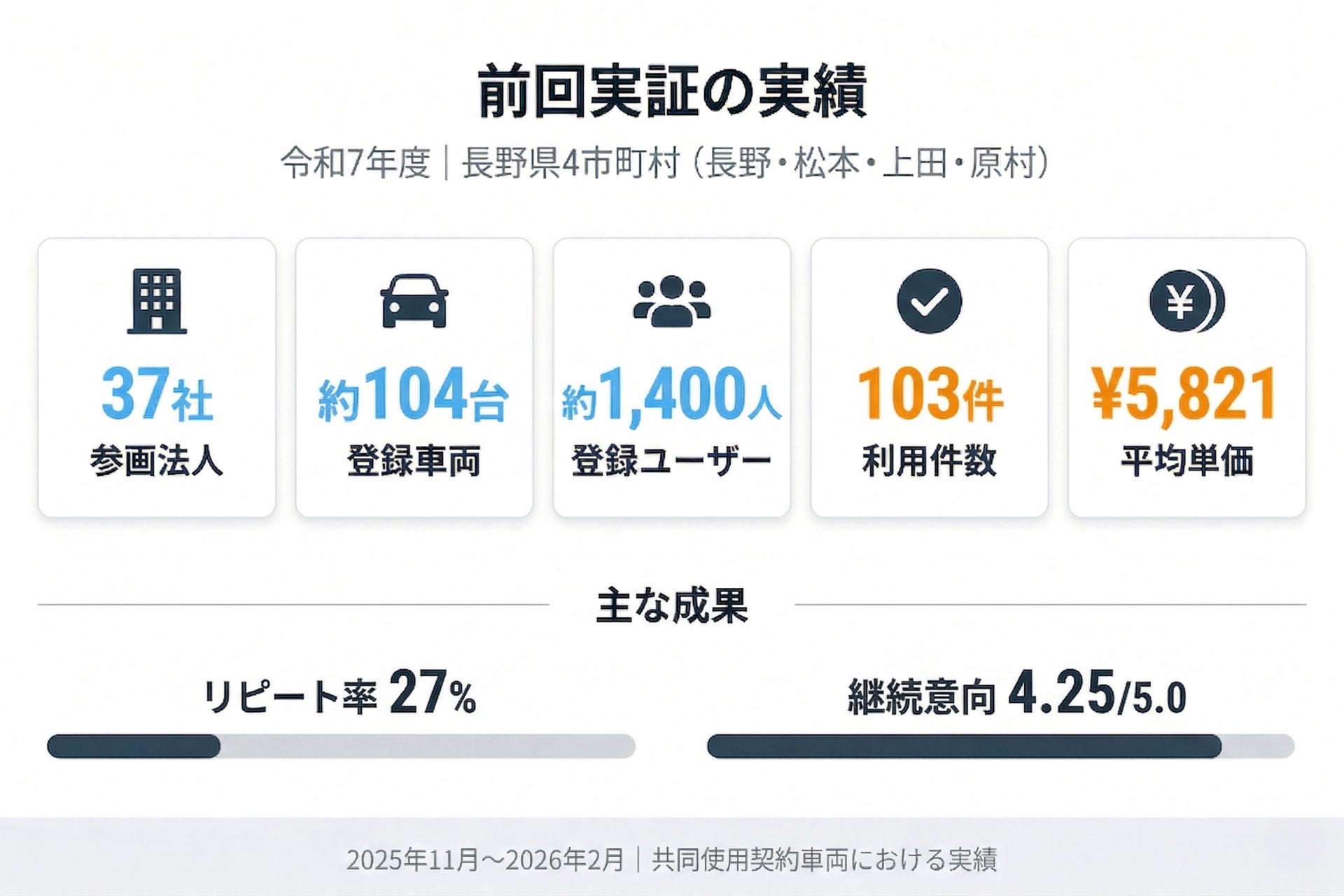国土交通省は「地域公共交通リ・デザイン実現会議」において、バスやタクシーだけでなく地域に存在する自家用車・社用車などの輸送資源を総活用する方針を打ち出しています。OURCARはこの方針のもと、24時間無人で自家用車をシェアできるプラットフォームとして、2025年度に国土交通省COMmmmONSプロジェクトの委託を受け、長野県内4市町村(長野市・松本市・上田市・原村)で自家用車を活用したカーシェアの実証を行いました。共同使用契約(※2)の法的要件を満たす契約フローや維持費に基づく実費精算の仕組みに加え、キーボックスによる24時間無人での車両受け渡しをシステム上で実現しています。