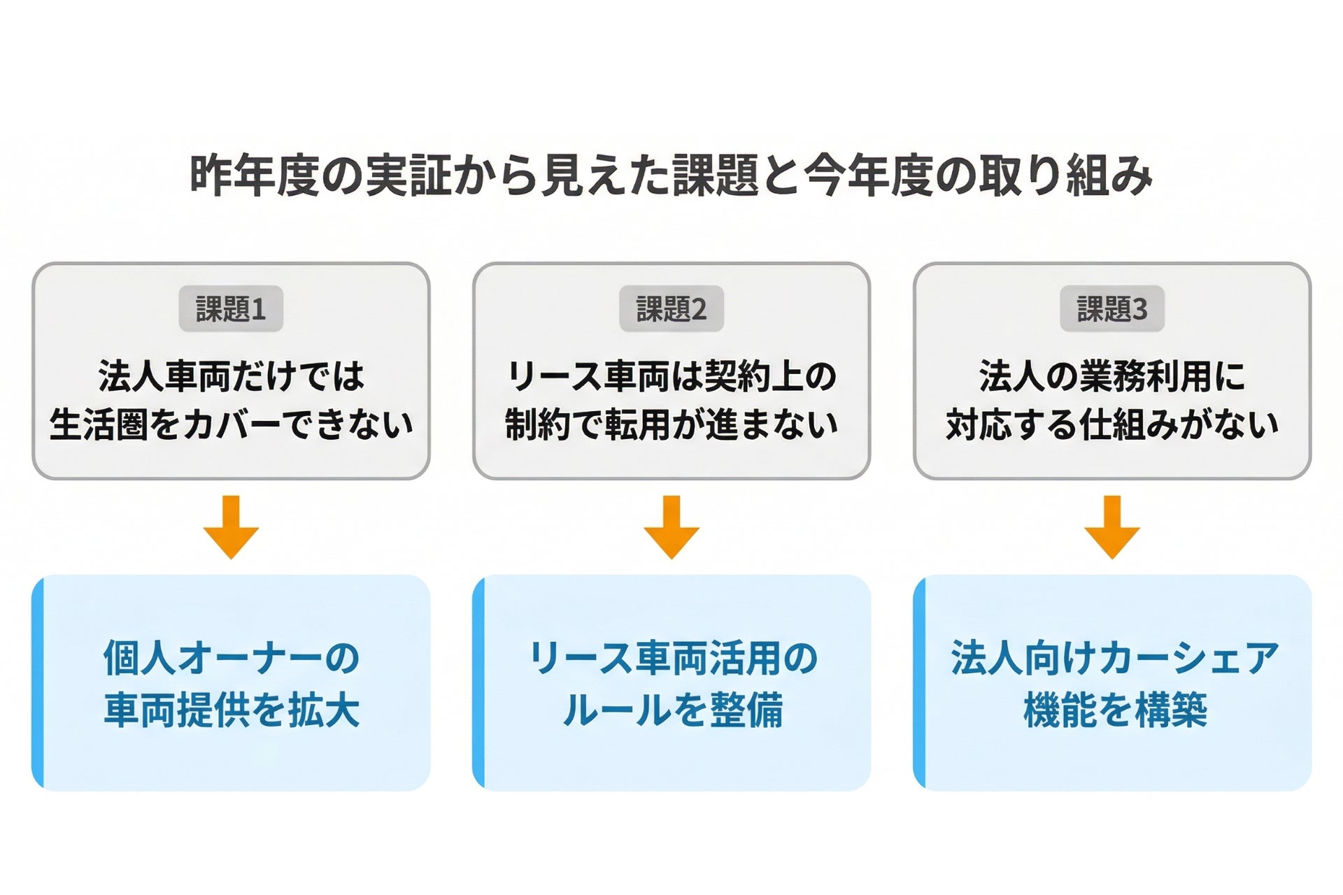昨年度の実証で自家用車カーシェアの有効性が確認された一方、サービス拡大に向けた課題も明らかになりました。法人車両だけでは提供場所が事業所周辺に偏るため、住宅地や駅周辺など生活圏全体をカバーするには、個人が所有する車両もカーシェアに提供できる仕組みが不可欠です。また、車両を貸し出したいという法人の声が多く寄せられた一方、リース車両は契約上の制約から転用が進んでおらず、リース車両を活用するためのルール整備が急務となっています。加えて、法人から業務利用のニーズも確認されており、経費処理や権限管理に対応したシステムの整備が求められています。