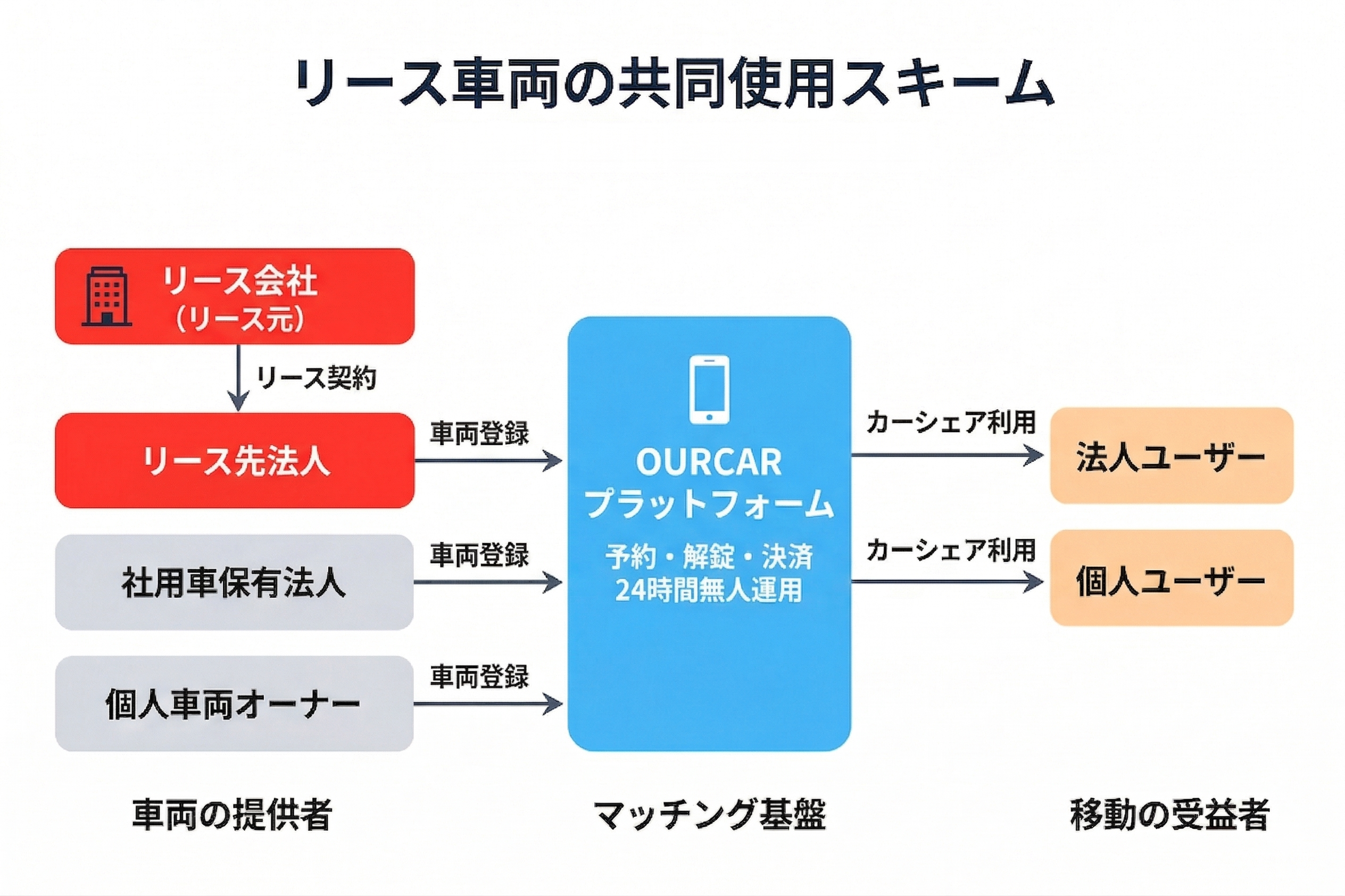 社用車に加え、リース車両をカーシェアに活用するための仕組みづくりに取り組みます。リース車両を使用する法人(リース先)は、業務時間外の遊休時間を活用して車両を地域に貸し出すことが可能になります。これにより、実質的なリース料の負担軽減につながるとともに、地域の移動手段を増やすことができます。リース会社(リース元)にとっても、リース先への新たな付加価値提案となります。