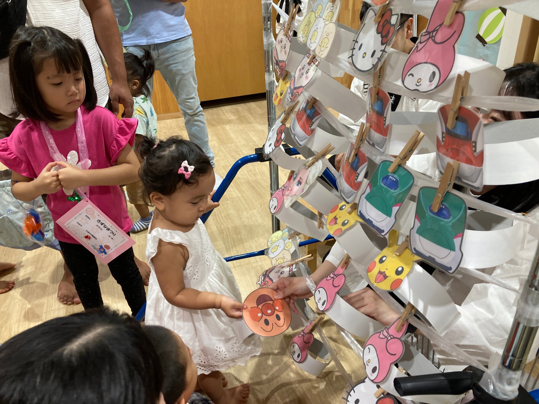ゆらゆら泳ぐ金魚のおもちゃを見つめながら、真剣なまなざしでポイを動かす姿が印象的でした。金魚をすくい上げるたびに「とれた!」と歓声があがり、夏祭りらしいにぎやかな時間となりました。