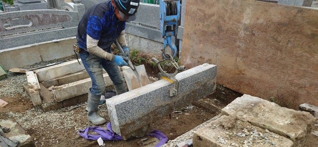 1・2級土木施工管理技士の資格を持つ「解体のプロ」が、責任を持って安全かつ丁寧に撤去・解体を行います。基礎部分や外柵の解体、地面の整地まで、最後までしっかり対応します。墓石の撤去には、「カニクレーン」(画像上)を使用。土葬の掘り起こしなど重機が使用できない場合は、手作業で確実に対応します。