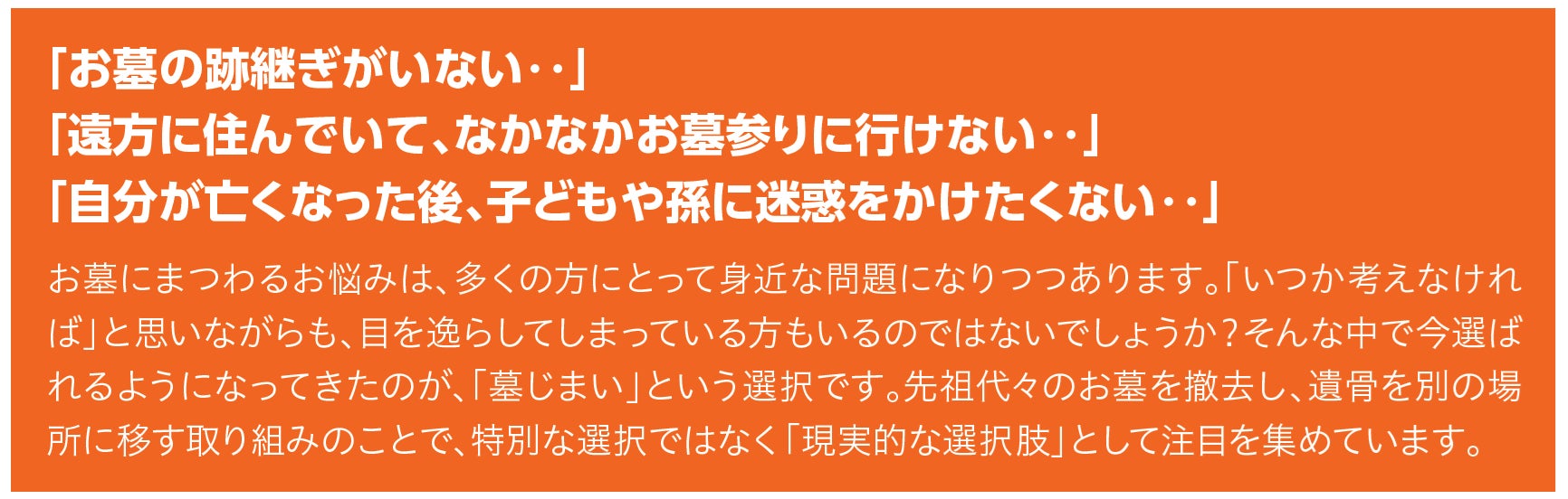 親御さんを福島県に残したまま、他県でご家庭を築いたあなたへ。わが子が他県で暮らし、将来福島に帰ってこないと悩んでいるあなたへ。ご家族みんながお元気な『今』のうちに、お墓の将来について考えてみませんか?