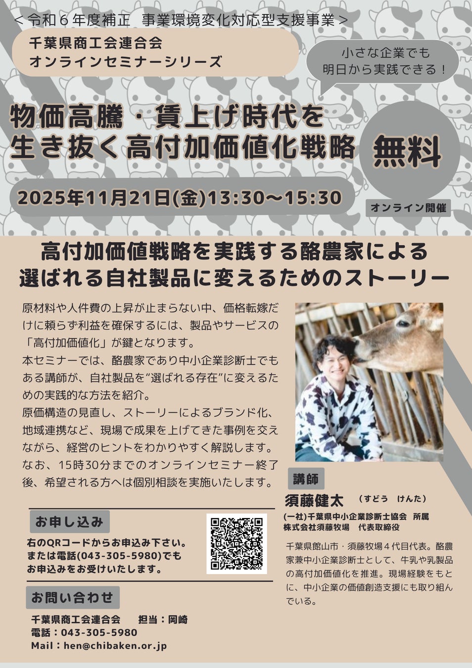 千葉県内の中小・小規模事業者のご商売を支援している千葉県商工会連合会(住所:千葉県千葉市中央区中央4丁目16番1号 建設会館ビル5階 会長:寒郡茂樹)では「物価高騰・賃上げ時代を生き抜く高付加価値化戦略」と題したオンラインセミナーを2025年11月21日13時30分から実施します。
