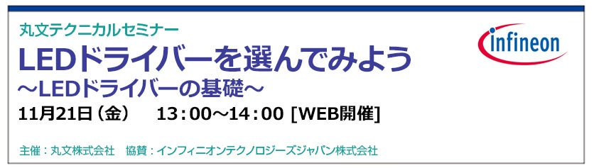 エレクトロニクス商社の丸文株式会社(代表取締役社⻑ 兼 CEO / COO︓堀越裕史、本社: 東京都中央区、以下、 丸⽂)は、11月21日(金)に LEDドライバーの概要と選び方およびインフィニオンLEDドライバー製品が分かる無料のオンラインセミナーを開催します。