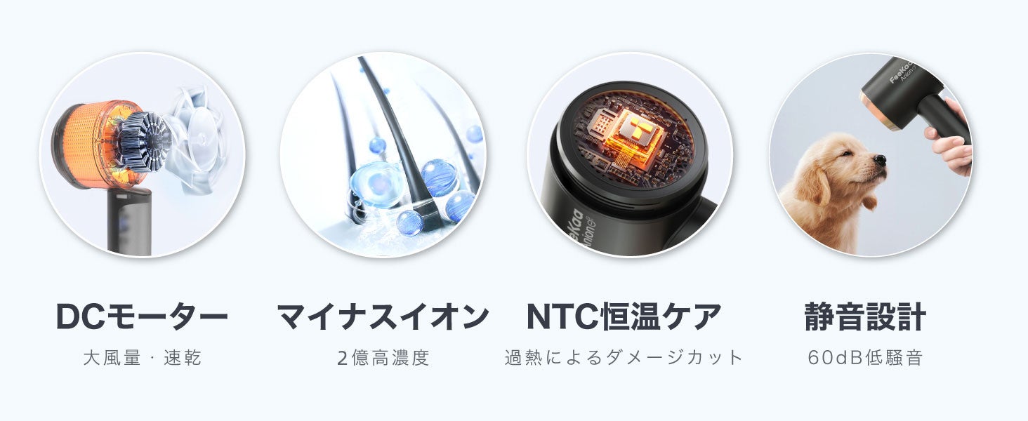 Feekaa スピーディーイオンドライヤーは、2億もの高濃度マイナスイオンを放出し、インテリジェントなNTCサーモスタットを搭載した大風量ヘアドライヤーです。