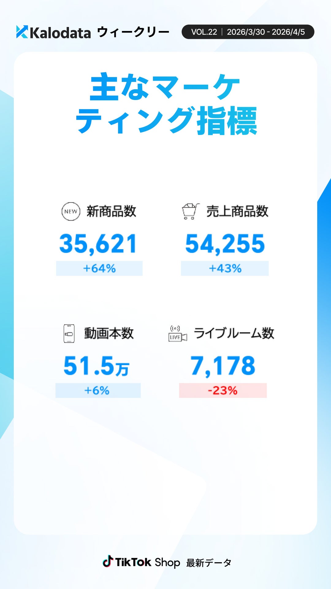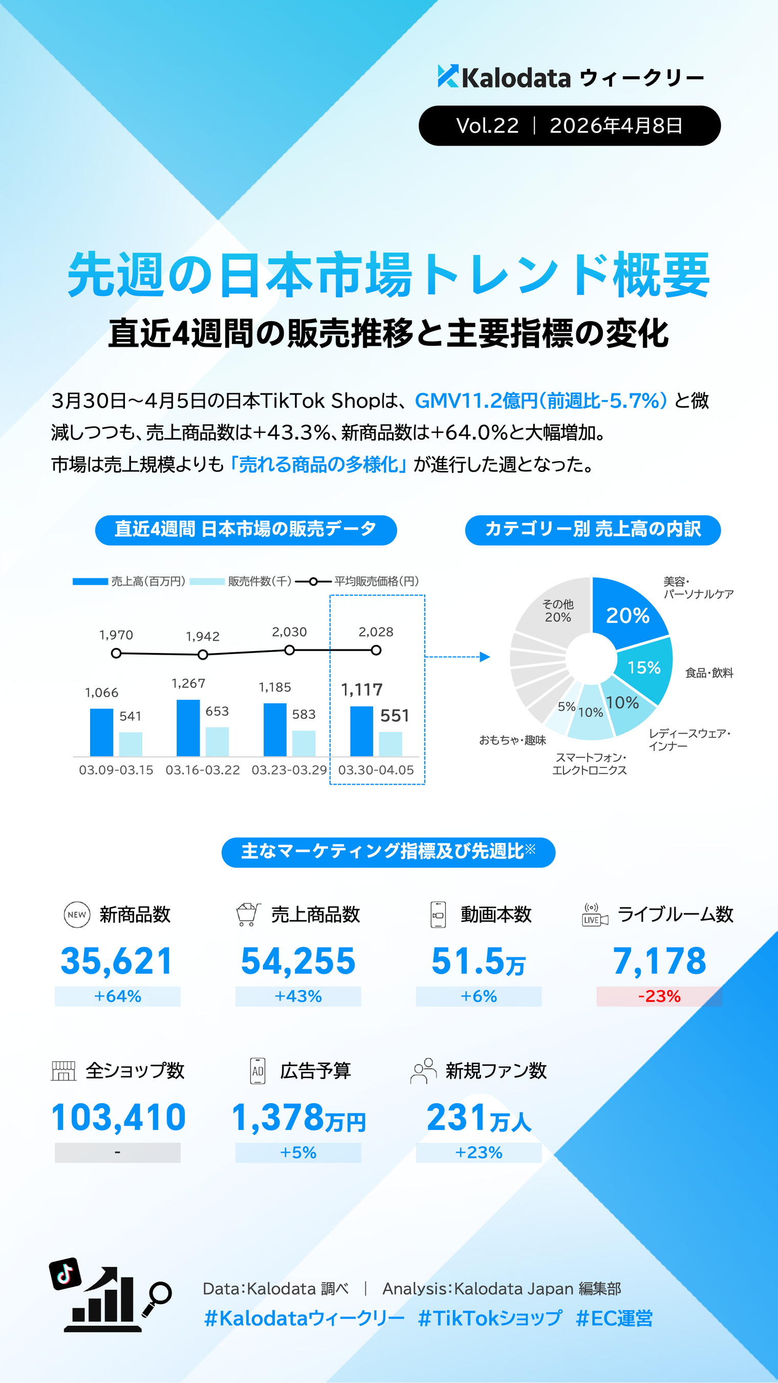 【Kalodataウィークリー】日本TikTok Shop市場、「売れる商品数」が+43%増加 分散型マーケットへの転換が加速(3月30日週)