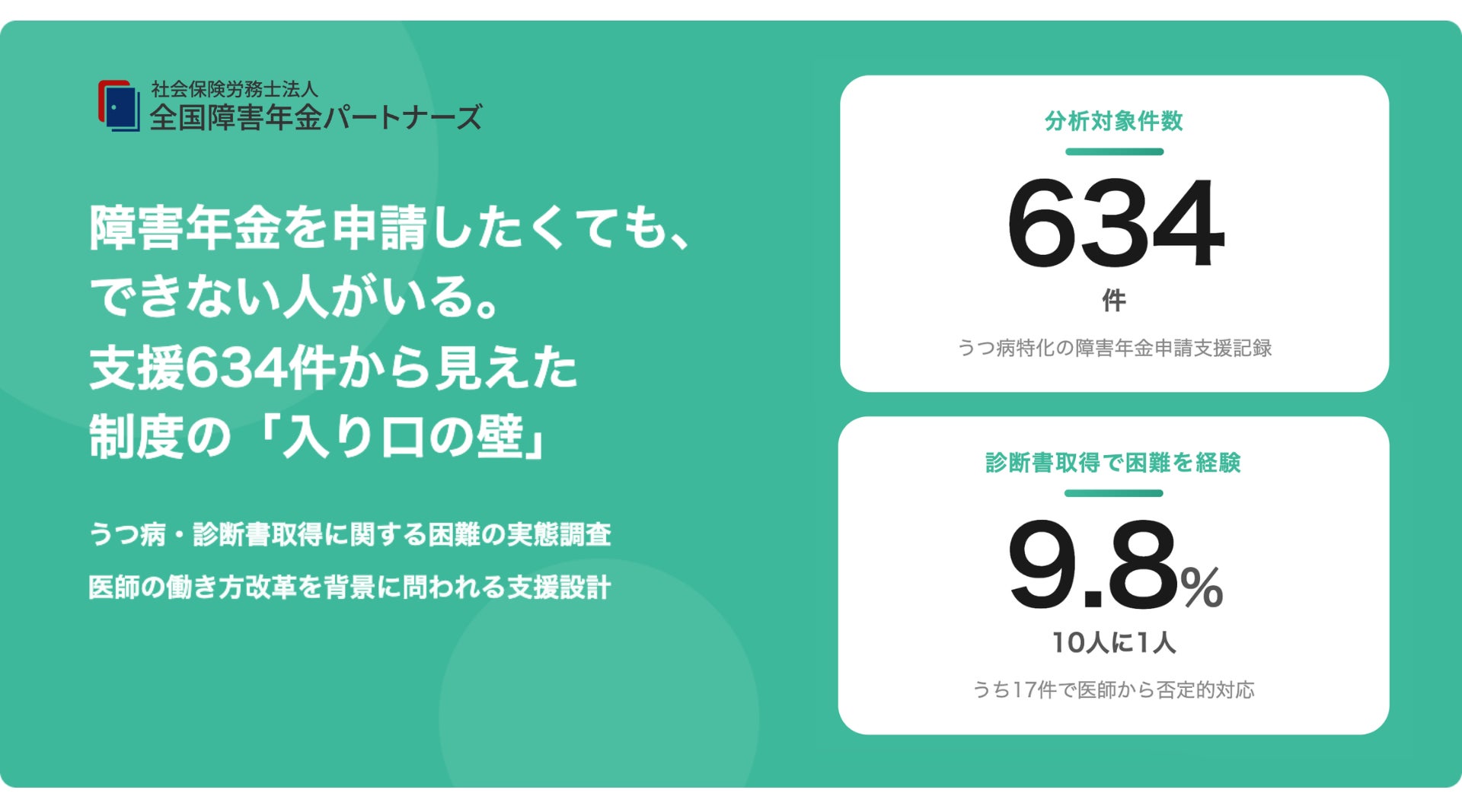 うつ病特化の障害年金申請支援専門として2,500名超の支援実績を持つ、社会保険労務士法人 全国障害年金パートナーズ(東京都千代田区、代表:宮里竹識)は、自社が保有する「お客様の声」634件の支援記録を分析したところ、62件(9.8%)が診断書の取得に何かしらの困難を経験していたことが明らかになりました。さらにそのうち17件では、医師・医療機関から診断書作成を断られるケースも見られました。