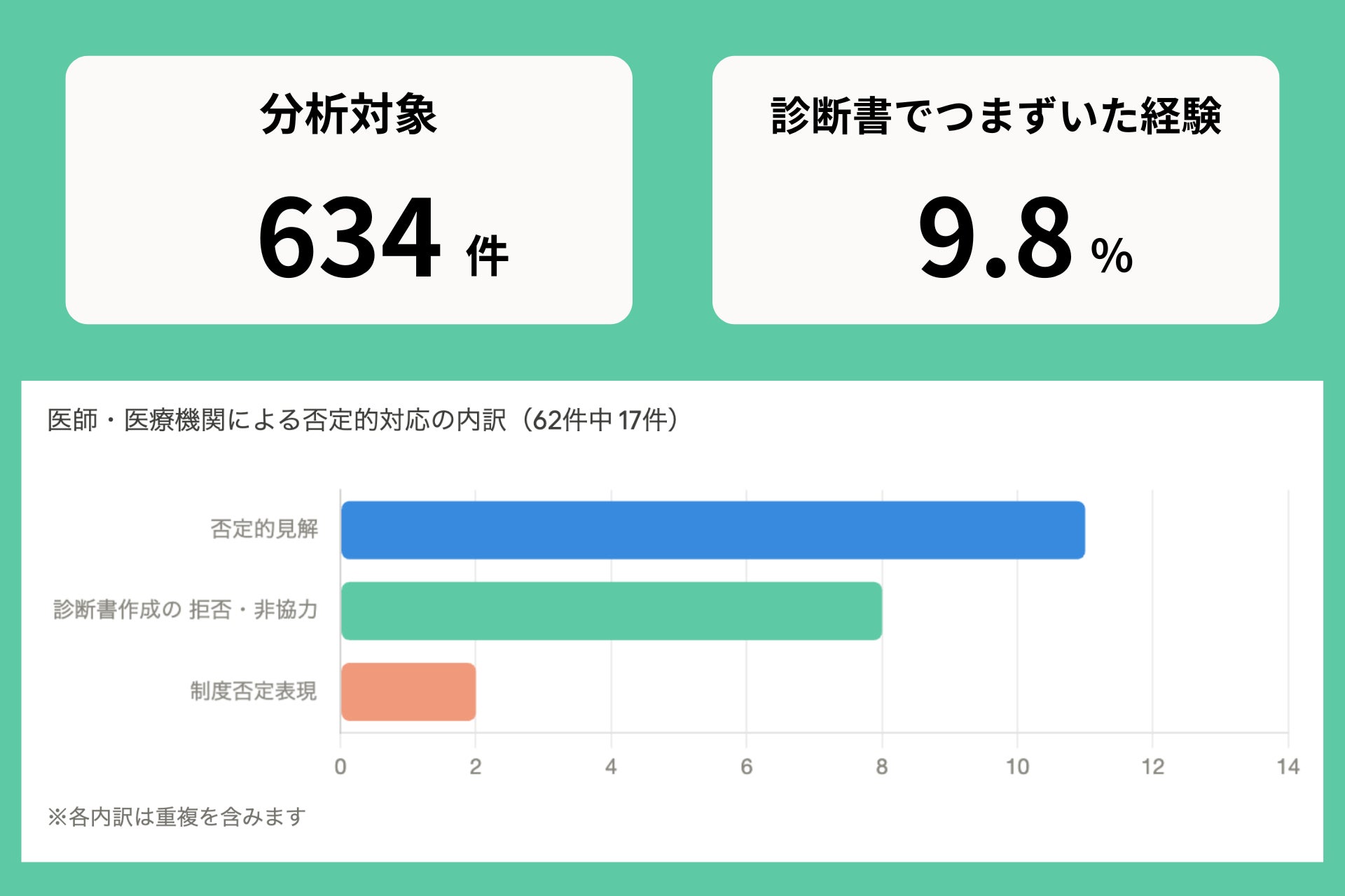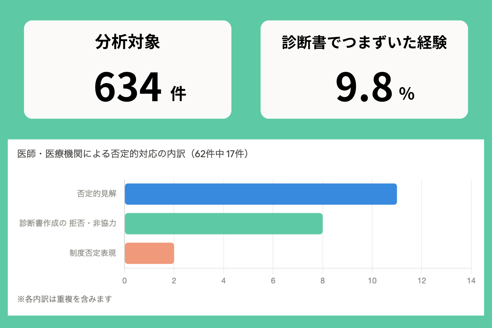 当法人が保有する634件の支援記録を分析した結果、62件が診断書・医師に関わる何かしらの困難を経験したケースに該当しました。