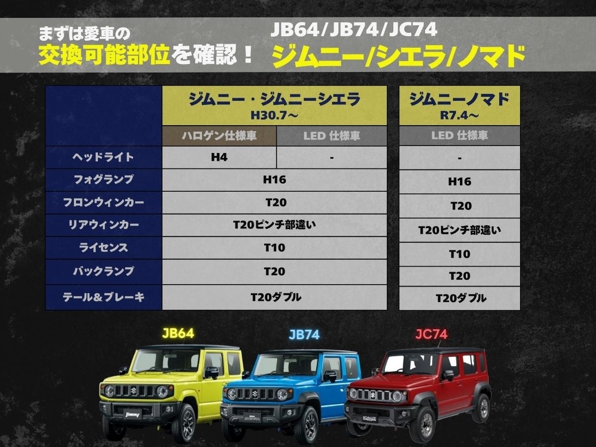 「ジムニー」「ジムニーシエラ」、さらにカスタムモデルとして人気の「ジムニーノマド」といったターゲット車種ごとに、fcl.が誇るLEDヘッドライト、フォグランプ、ウィンカー、バックランプなど、各種カスタムライトの適合情報を分かりやすくまとめています。オーナーは自身の車種に最適なパーツを簡単に見つけることができます。