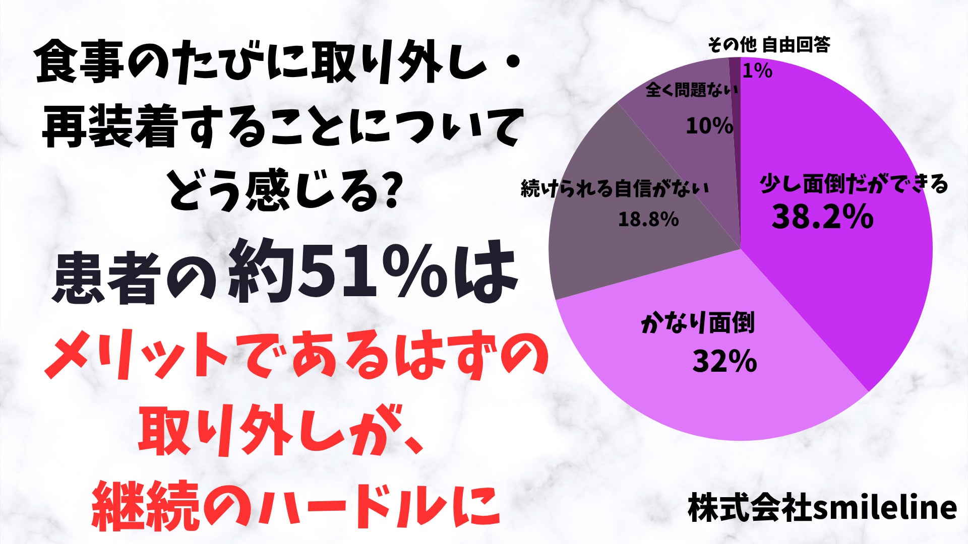 50.8%の人が食事のたびに取り外し・再装着することについて取り外しを「かなり面倒」と感じたり「続けられる自身が無い」と感じており、
