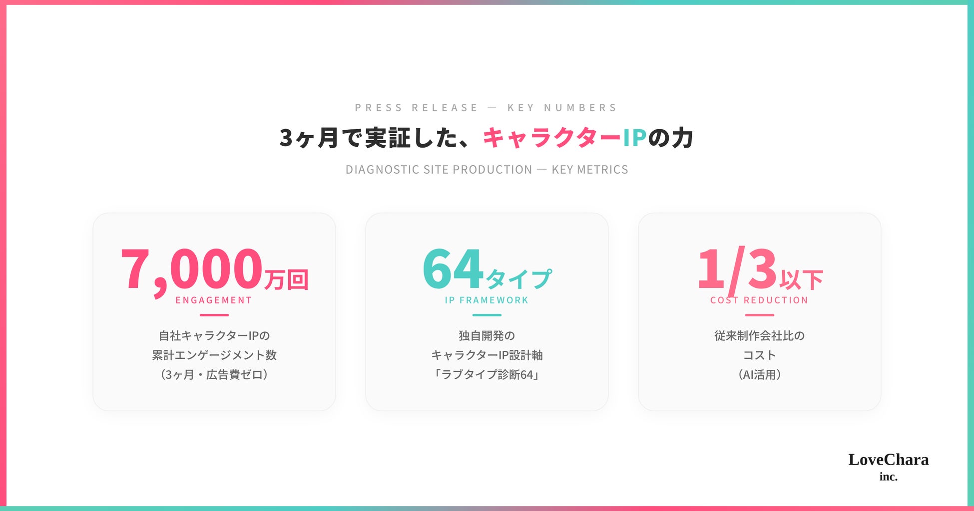同社は、キャラクターが「なぜ愛されるのか」「なぜシェアされるのか」を64のタイプに分類・体系化した独自のIPフレームワーク「ラブタイプ診断64」を開発。