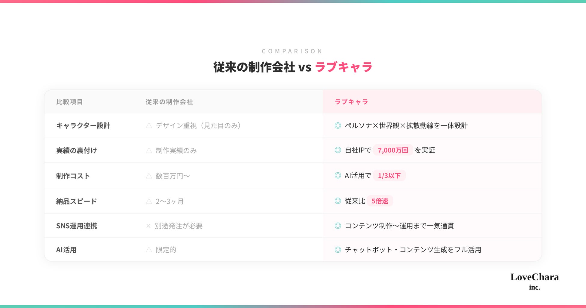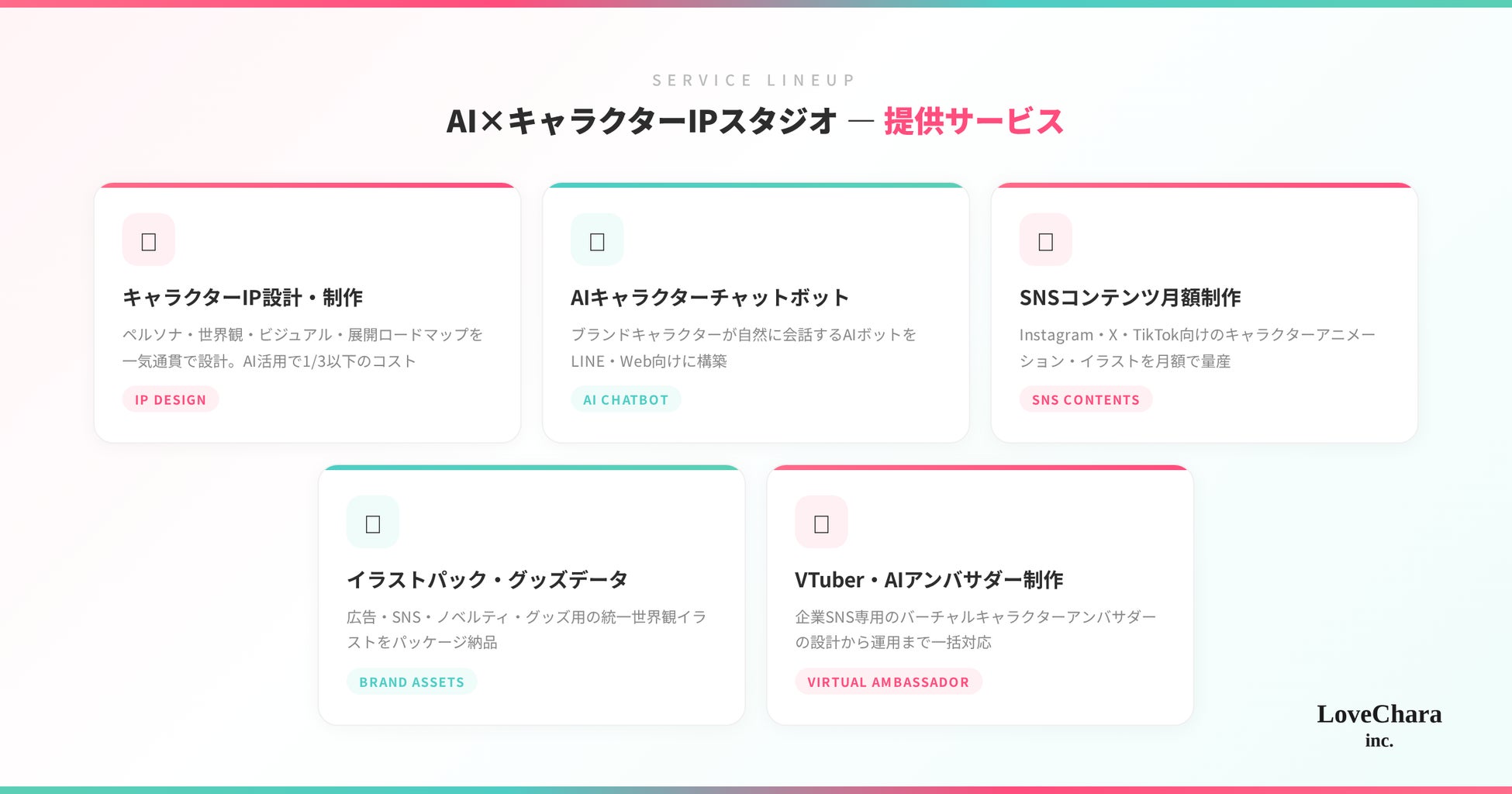 株式会社ラブキャラ(代表取締役:平山英司)は本日、AI×キャラクターIPスタジオとして企業向け受託サービスを正式に開始することを発表します。