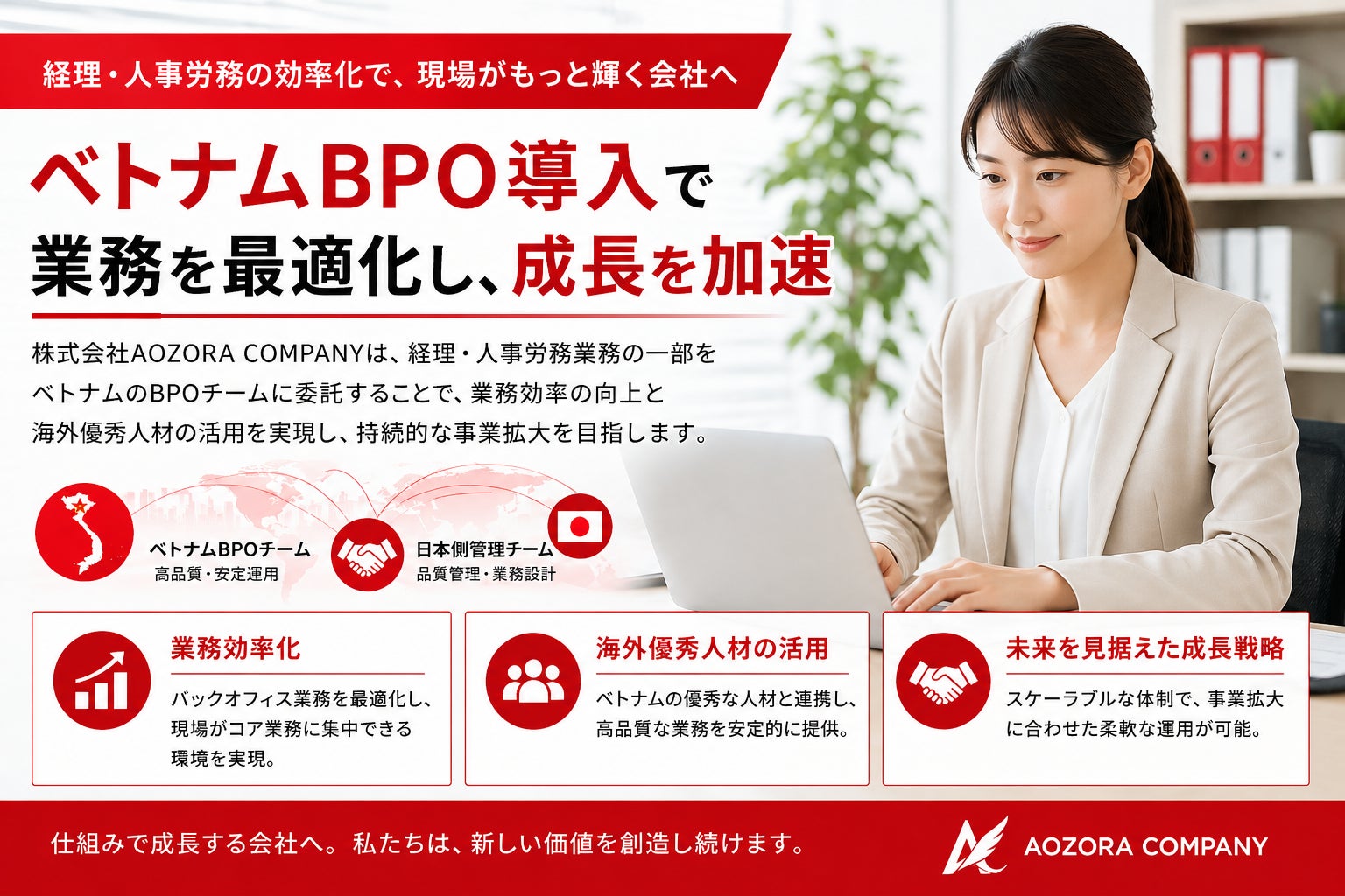 株式会社AOZORA COMPANY(本社:新潟県新潟市、代表取締役:高橋拓巳)は、経理および人事労務業務の効率化と高度化を目的として、ベトナムを拠点としたBPO(ビジネス・プロセス・アウトソーシング)体制を構築したことをお知らせいたします。