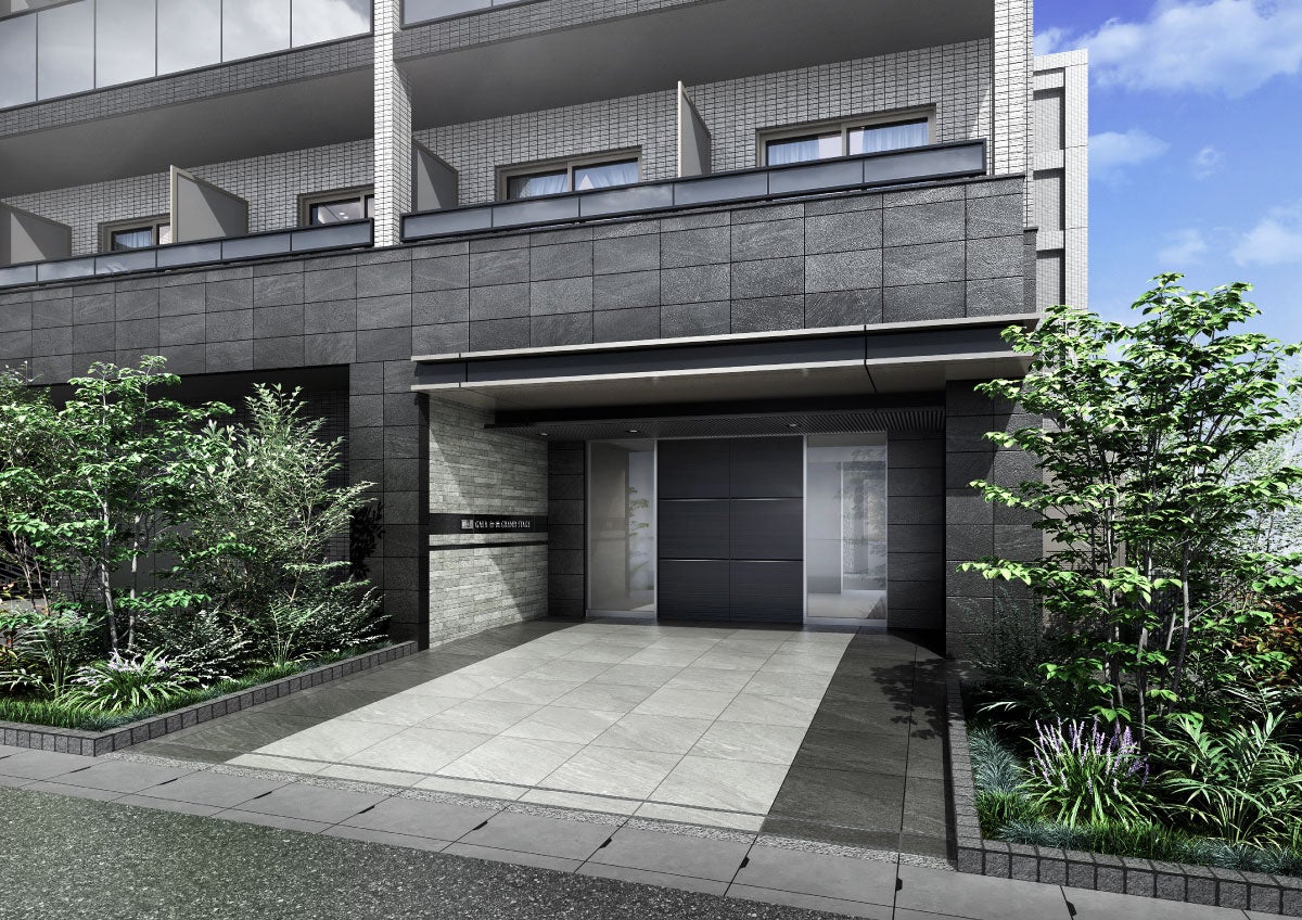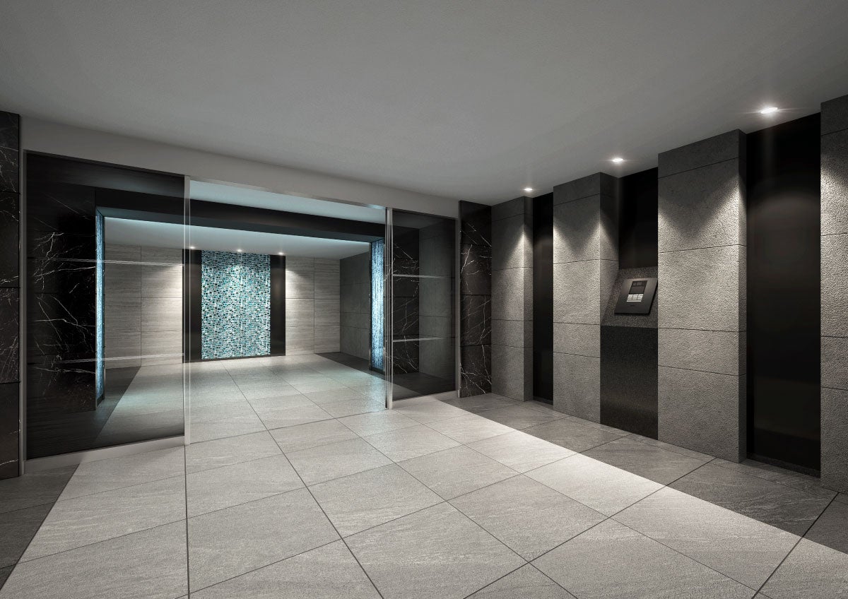 外観は、街の景観に馴染む落ち着きのあるダークグレーを基調とし、全体をモノトーンでまとめつつアクセントとしてホワイトの縦ラインを効果的に配置することで、時代に調和するシックなデザインを目指しました。重厚なエントランスを抜けた先には、鮮やかなライトブルーのガラスとシンボリックな装飾により癒しの空間が広がるエントランスホールが、住まう人を優雅にお出迎えします。