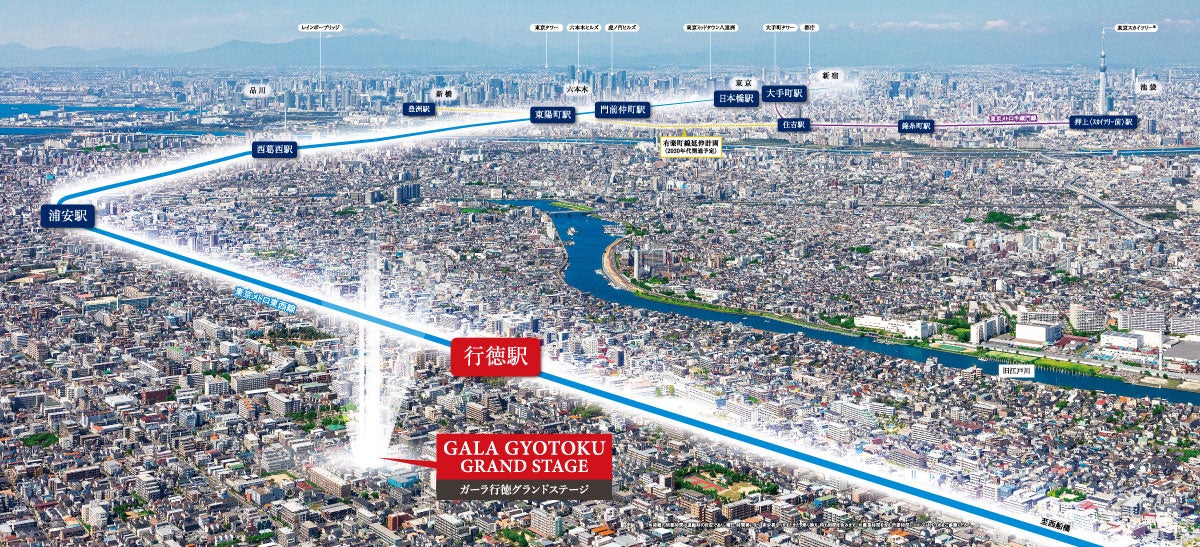 東京メトロ東西線「行徳」駅からは、日本を代表するビジネスエリアとして知られる「日本橋」や「大手町」へのダイレクトアクセスが可能。加えて、「新宿」や「渋谷」、「品川」駅といった都内主要駅へも乗り換え1回で行けるなど、様々なシーンで利便性の高さを誇ります。