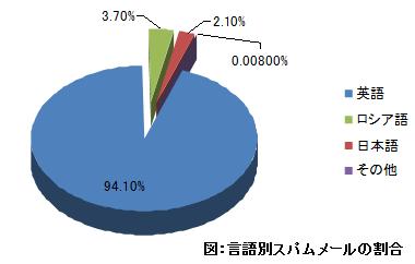 検証環境に送られてくるスパムメールを言語別に分類すると、英語が全体の94.1%を占め、ロシア語、日本語を含めると全体の99.992%を占める結果となった。残り0.008%は、中国語、韓国語であった。(「図:言語別スパムメールの割合」をご参照ください。)
