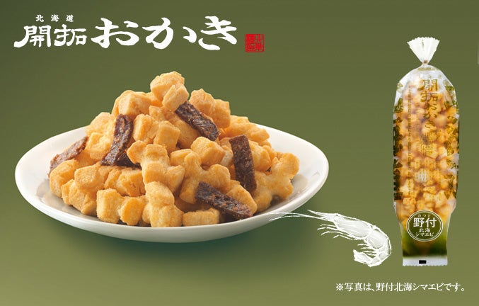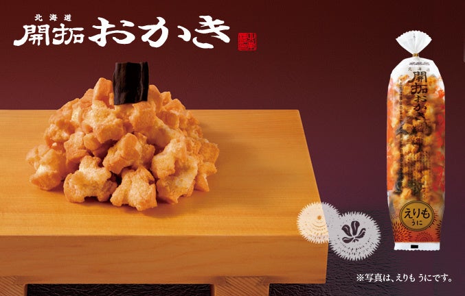 冷えたビールのおつまみにも最適な「北海道開拓おかき」は、7種類の通年商品のほか、期間限定の「えりも うに」味と「野付 北海シマエビ」味も好評販売中。