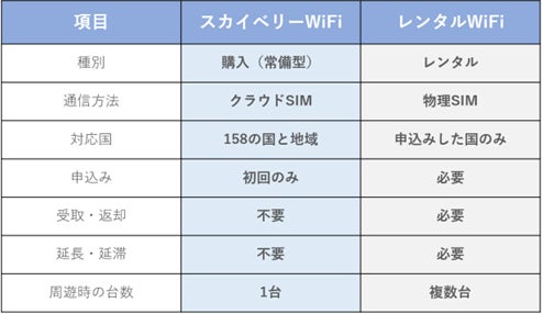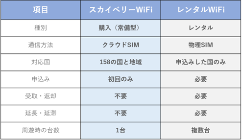 海外WiFiと言えばレンタルが一般的ですが、WiFiレンタルには、「渡航時の貸出/返却の手続きが手間」「移動日も料金がかかる」「日量制限がある」「借りた端末の電池の持ちが悪い」「複数国渡航には国ごとに端末が必要」といった悩みがつきものです。