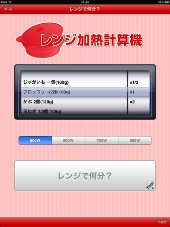 同書のレシピに加え「主要食材レンジ加熱計算機」も搭載、20種の食材について電子レンジの出力別に加熱時間が計算できる機能を提供している点も特徴です。