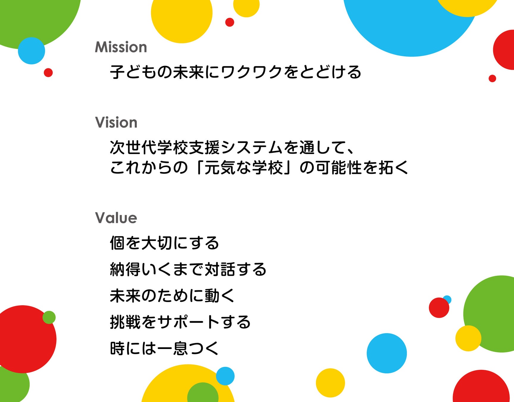 EDUCOMは、今回の経営体制の変更により、これまで大事にしてきた「元気な学校づくりを応援します。」という想いを守りながら、学校現場の課題を解決するため、システムとサポートをより発展させ、これまで以上に、学校現場の夢の実現のお手伝いをしていきたいと考えています。学校現場の先生方はもちろん、未来を支える子どもたちを育むことを使命と捉え、我々が果たすべき責任、活動すべき内容を明確にするため、ミッション・ビジョン・バリューを刷新しました。