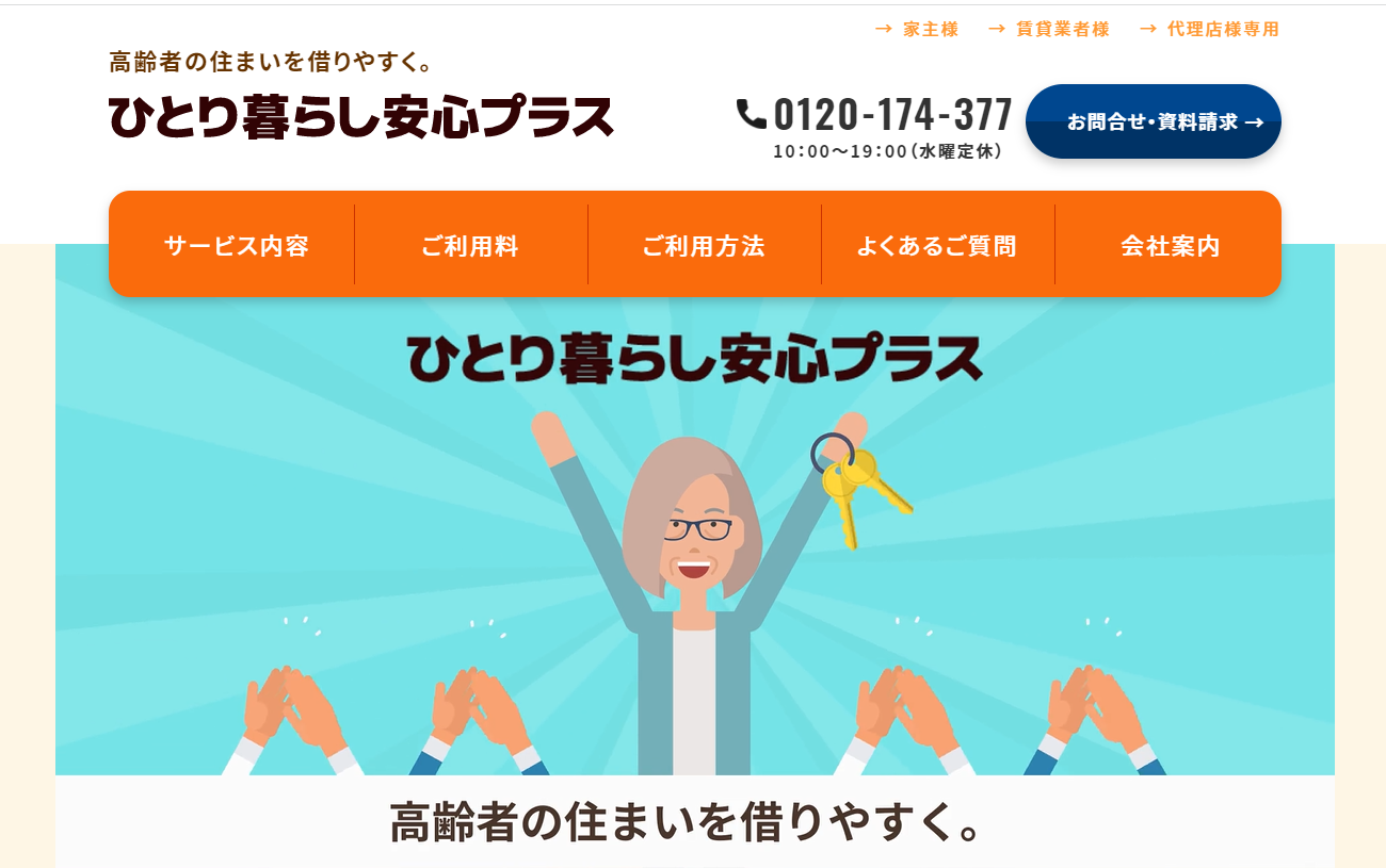 「ひとり暮らし安心プラス」は単身高齢者の賃貸住宅入居に立ちふさがる障壁を安価にて取り除き、家主側の不安を解消し、ひいては単身高齢者の賃貸住宅入居を容易ならしめるサービスです。