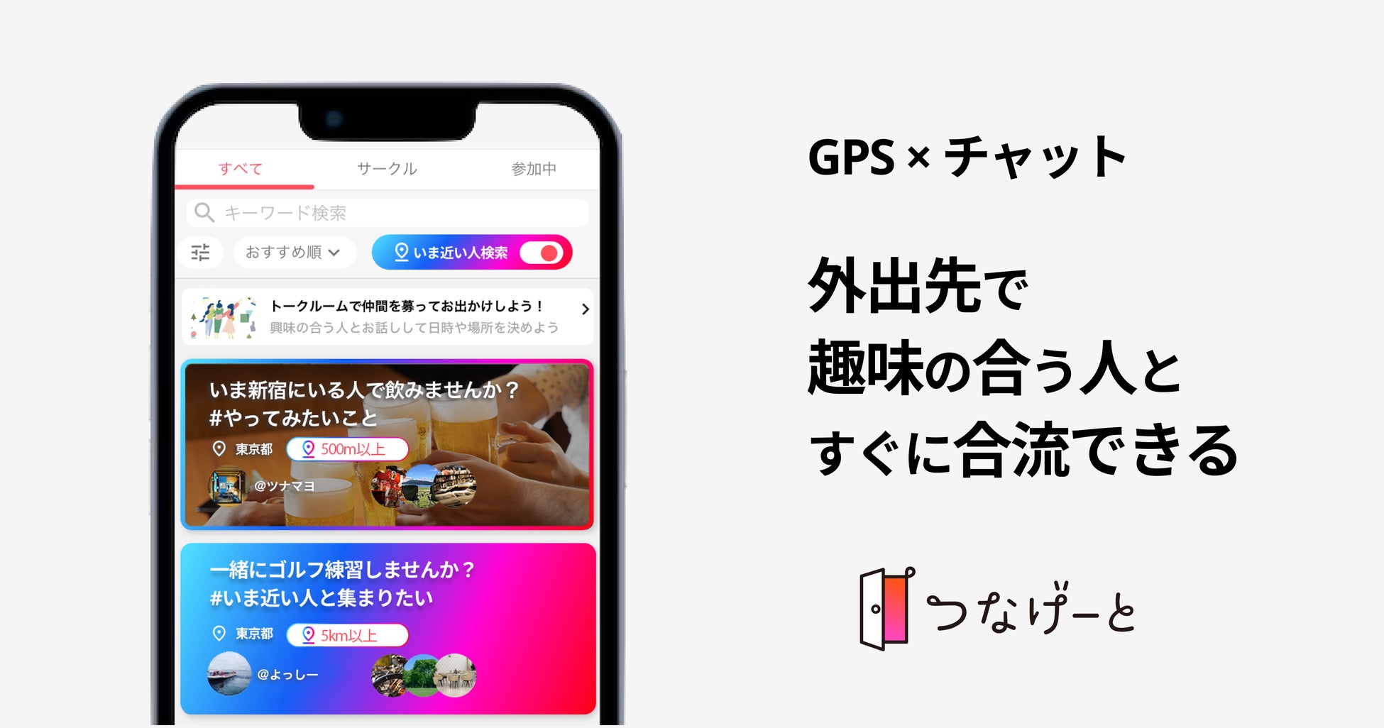 GPSとチャットルームを連携し、いま近くにいる人と合流してすぐに趣味を楽しめる「いま近い人検索」機能をリリース! 友達マッチングのコミュニティアプリ「つなげーと」